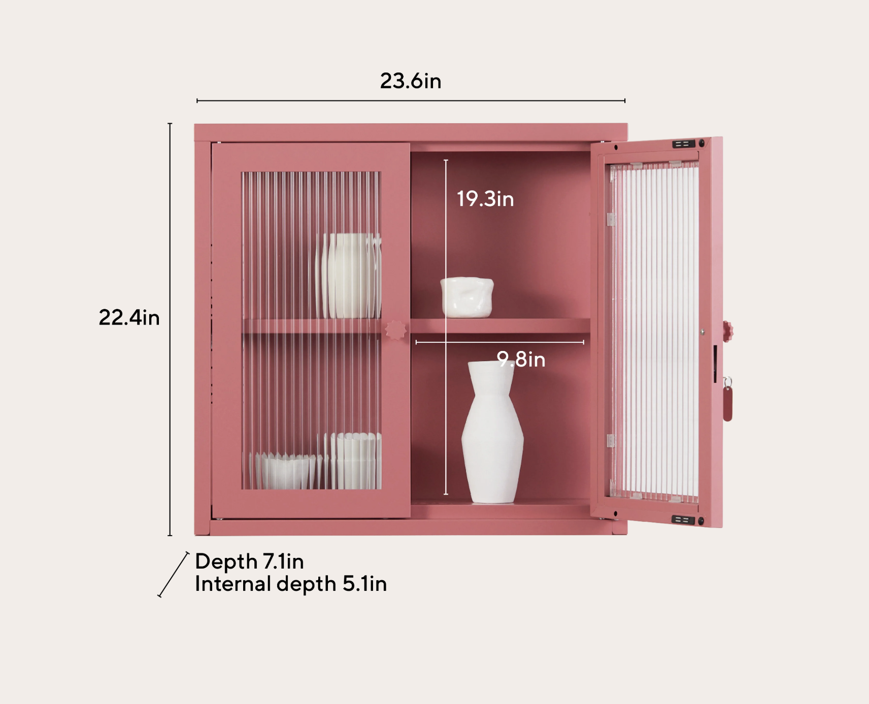 Fluted glass panels are set in a metal frame with medallion handles, a lock, a custom Mustard enamel keyring and wall attachment points.
